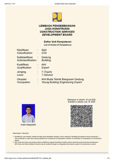 Selain latar belakang akademik di bidang arsitektur, Imam Saepulloh juga memiliki Sertifikat Kompetensi pada bidang Jasa Konstruksi dengan kualifikasi Ahli Muda Teknik Bangunan Gedung, berlaku selama 5 tahun, dengan klasifikasi Sipil, subklasifikasi Gedung, dan jenjang 7.